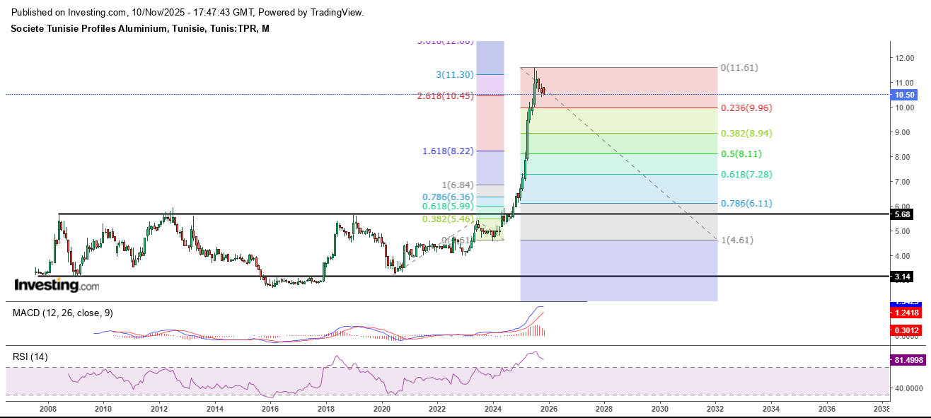 En mensuel, TPR est dans un cycle haussier depuis Mars 2016, la hausse à long terme pourra atteindre même 15 DT. Mais actuellement on est dans la sous vague 4 de vague 3. C'est une sous vague de consolidation et elle risque de tracer au moins 23,6 % de la sous vague 3 de la vague 3. Pour plus de détails voir la fibo à droite pour suivre le retracement de la sous vague 4. Le minimum est 9,96 DT.