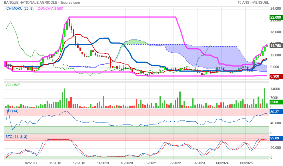 Volume : On observe une augmentation significative des volumes sur les dernières bougies mensuelles, ce qui confirme l'intérêt des institutionnels pour le titre.