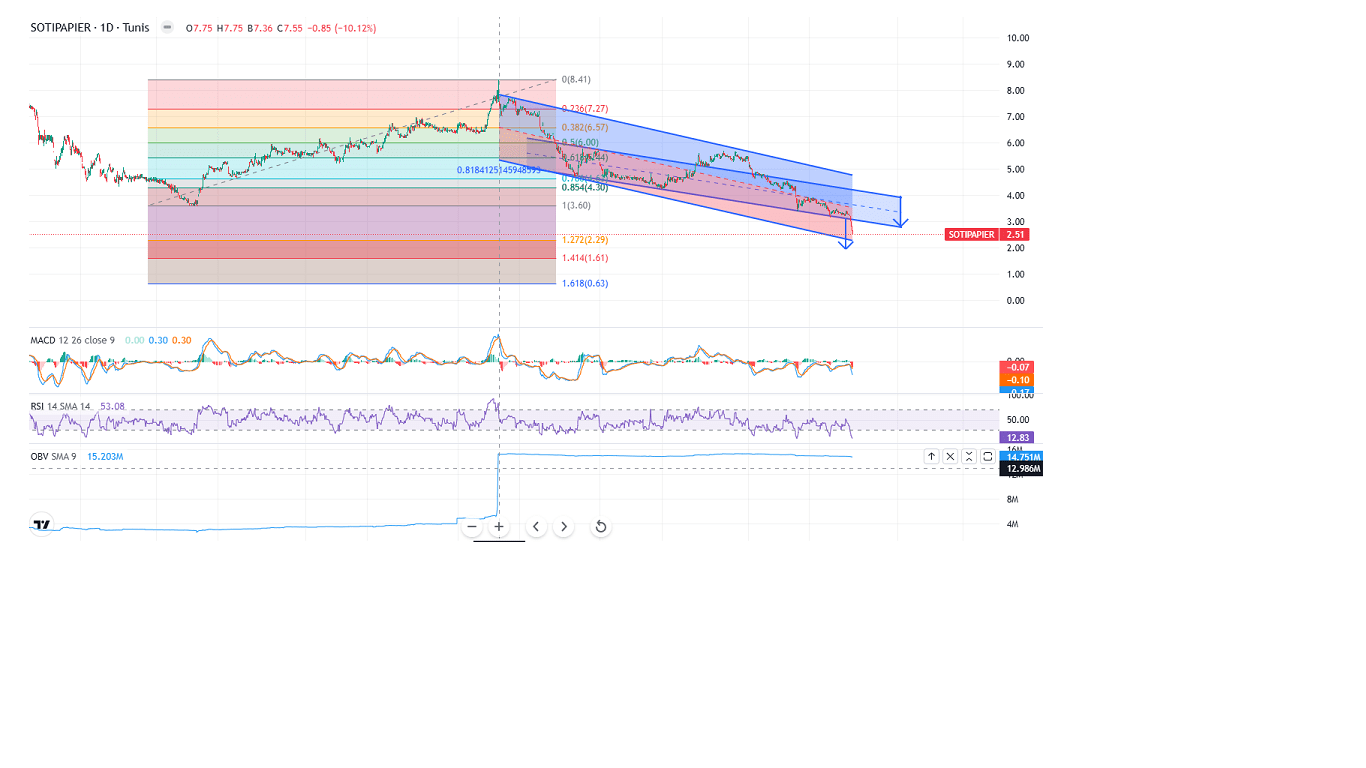 L'action va tester bientôt le niveau de 2,29 DT (Bas du canal de régression et Niveau 127% du retracement de la fibo) et elle pourra les casser. En cas ou la baisse persiste, SOTA ira tester le niveau de 1,95 D (Objectif de la sortie du canal). Dans le cas de cassure, elle ira chercher le niveau de 1,61 (Niveau 141,4 %de la Fibo):