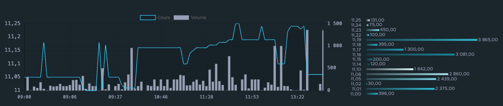 La BNA termine la séance avec un cours moyen pondéré (CMP) de 11,11 TND, en légère hausse par rapport au cours de clôture de la veille à 11,08 TND. Le dernier cours affiché à 11,06 n’est pas représentatif : c’est le CMP qui donne la vraie mesure de la séance.