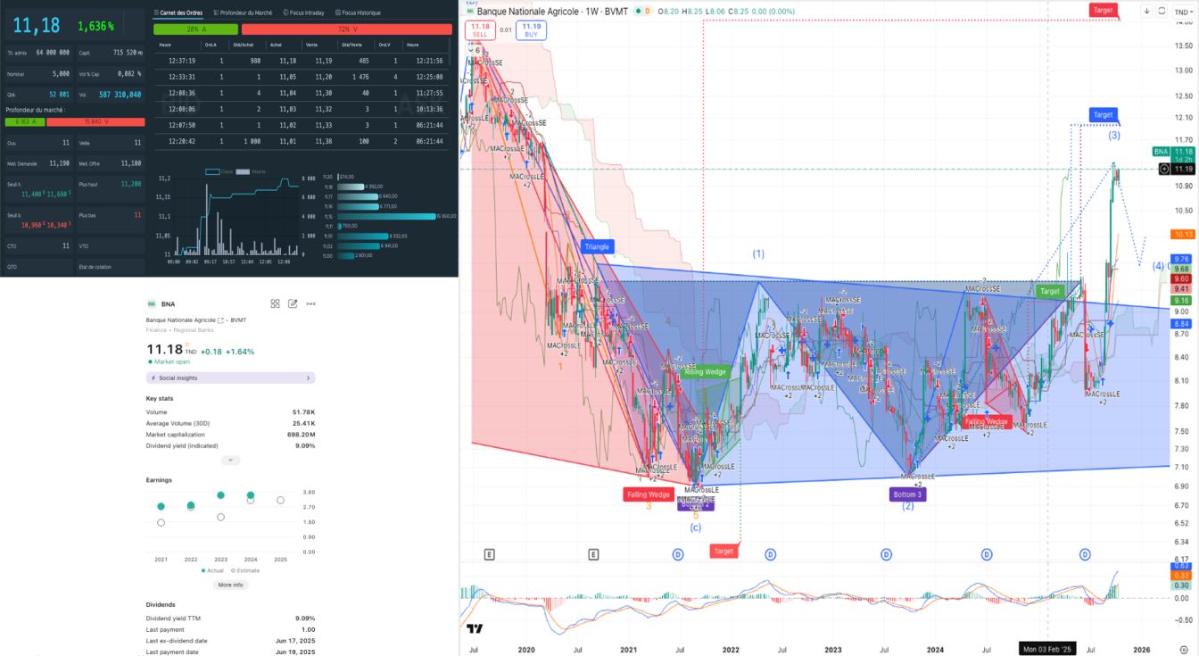 La BNA vient de franchir un seuil technique décisif autour de 11,10 TND, validant la sortie d’une large figure de consolidation triangulaire formée depuis 2021. Ce mouvement s’inscrit dans une vague 3 haussière d’Elliott, portée par une dynamique de volume en nette accélération et un momentum MACD puissamment orienté à la hausse.