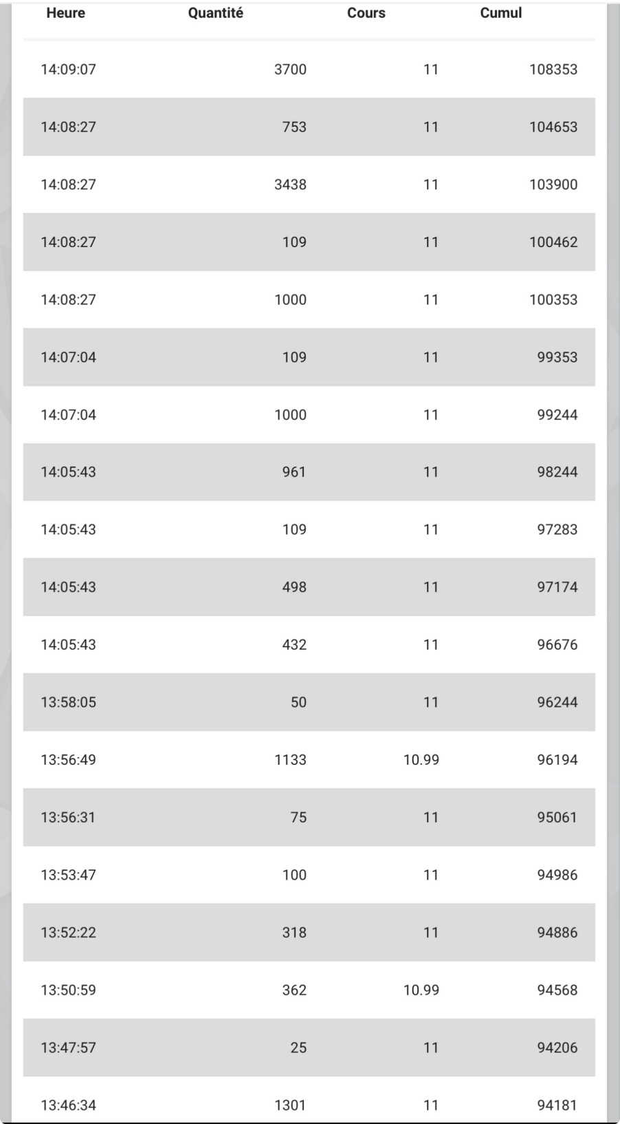 • Dernière demi-heure : 14 172 titres, soit 13 % du volume de la journée.