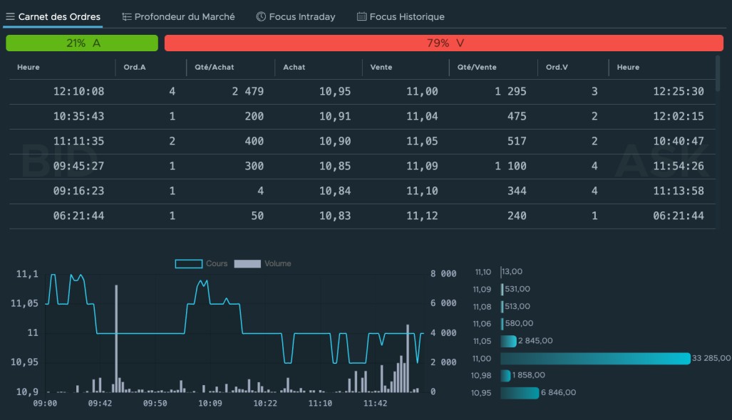 Sinon, coté marché, la séance du jour a livré des signaux très parlants : clôture à 11,100 TND (-1,33 %), avec un range intraday 10,960–11,200 TND et un volume traité de 666 K TND sur 60 408 titres. Sur le flux, on a vu une absorption nette du papier disponible sur la zone des 11,00, avec des acheteurs agressifs frappant l’ASK en répétition.