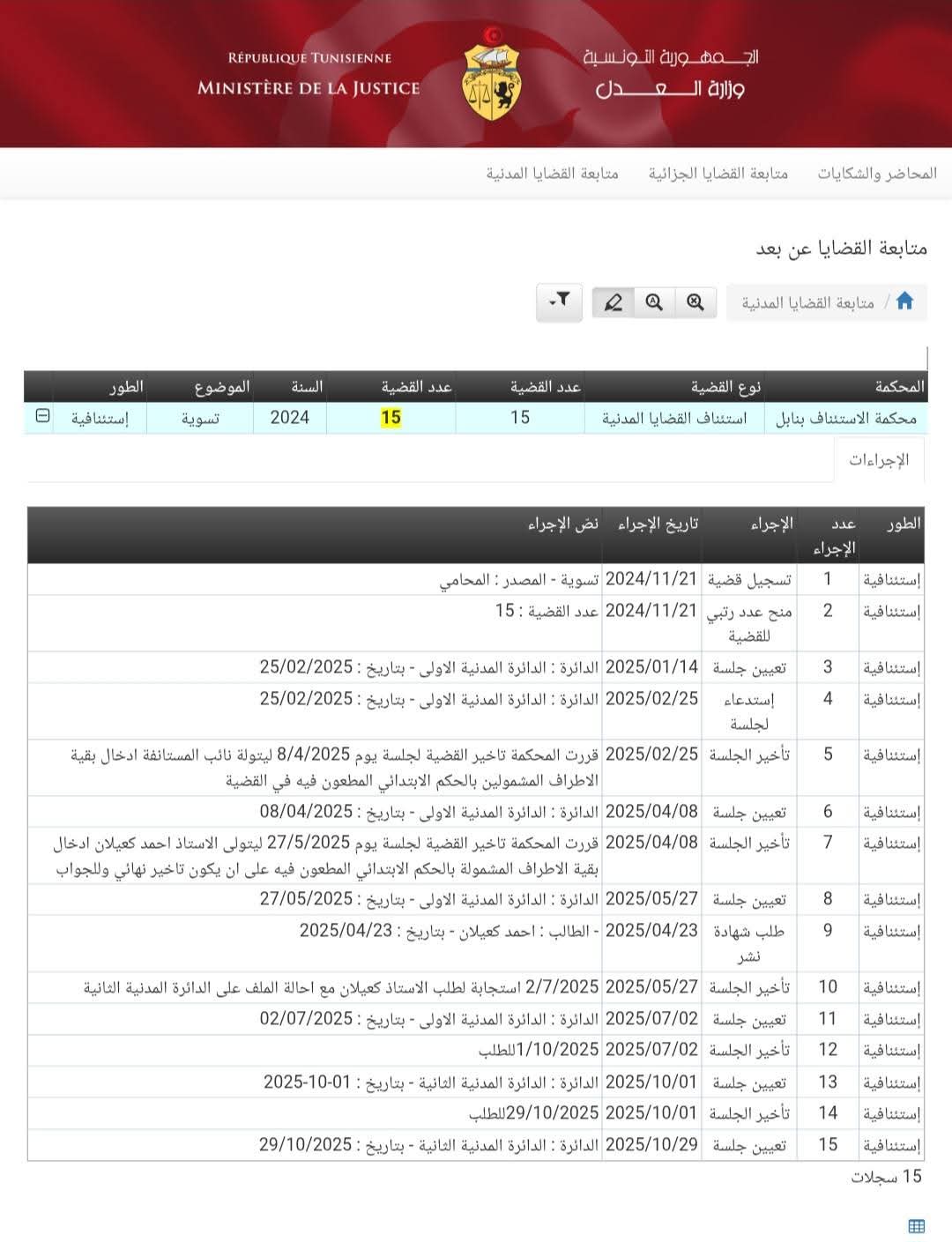 Le dossier, enregistré sous le numéro 15/2024, est examiné devant la Cour d’appel civile de Nabeul dans le cadre des procédures de règlement amiable et de rééchelonnement des dettes.