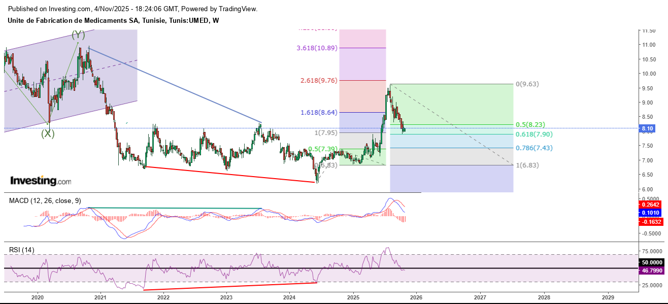 2) Le niveau de 7,9 sera cassé à la baisse => le cours ira chercher le niveau de 78,6 % vers 7,43 avec un rebond fort probable à la hausse.