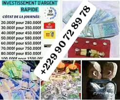 500 000 FCFA pour 50 milles600 000 FCFA pour 60 milles800 000 FCFA pour 80 milles1 000 000 FCFA pour 100 milles2 000 000 FCFA pour 200 milles1 000 000 reçoid 10 000 000 FCFA etc..Cela dépend du montant dont vous avez besoin.MULTIPLICATION DE RICHESSE ENCORE APPELÉ BLANCHISSEMENT D’ARGENT RAPIDE