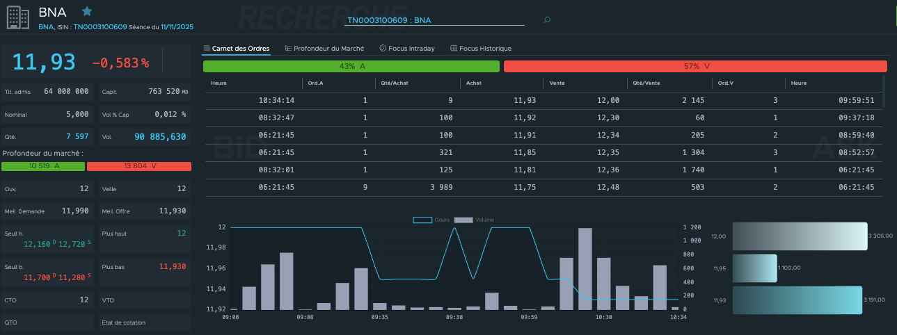12 DT pressenti et se confirme un véritable mur, c'est le prix d'émission de l'augmentation de capital de 2021 et le fiasco qui s'en est suivi. c'est une barrière psychologique . je ne vois pas la main d'un institutionnel jusqu'à maintenant, je ne pense pas que ça devrait tarder, en espérant qu'il parvient à éponger l'offre à 12 DT.