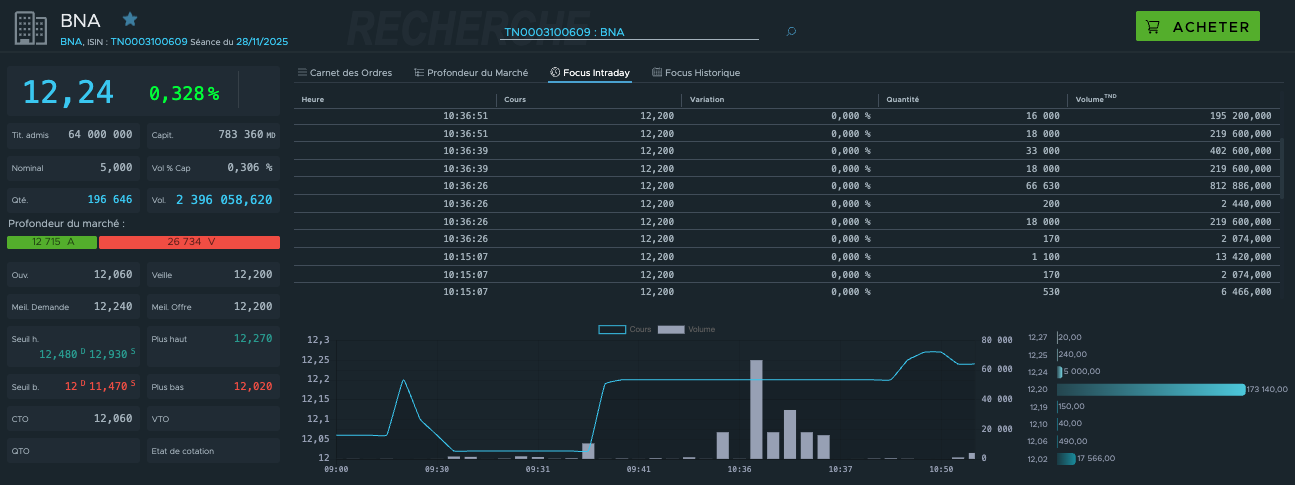 Vers le niveau de 12,38 DT une nouvelle micro structure est apparue. Avec de l’absorption comme tu viens de dire (icberg 12,25), un Market Maker ou un institutionnel est entrain d’absorber l’offre et il essaye de passer inaperçue en scindant ses ordres d’achat et en lissant les cours. C’est les caractéristiques d’une ré-accumulation et non pas d’une distribution.