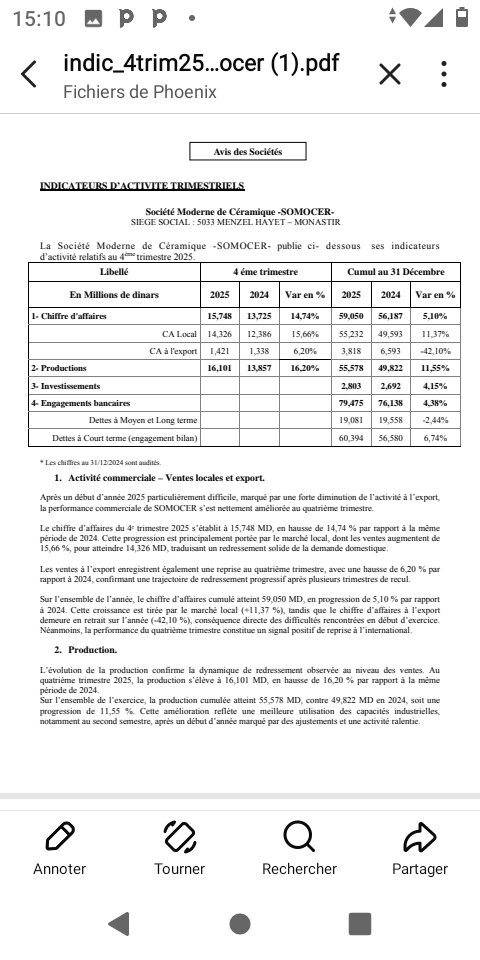 Avec un CA de 56 millions en 2024, perte d'exploitation = 25 millions, est ce qu'avec 59 millions de CA en 2025 qu'elle sera bénéficiaire? khallina min les charges financières et les provisions à constituer, hathomkon en 2éme lieu. inchallah rabbi yonfa5 fi souretha wa y mann3ouha SOMOCER