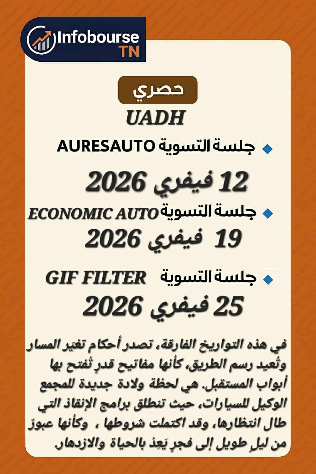 سيدي الكريم مهدي، يجدر التنويه بأن شركات المجمع ما تزال في طور التسوية وتحت أنظار القضاء، وجميع الأحكام الصادرة إلى الآن هي أحكام تحضيرية تمهيدًا لعودة النشاط. وعليه، لا يمكن الخوض في وضعية السهم أو استشراف الآفاق المستقبلية قبل صدور الأحكام النهائية