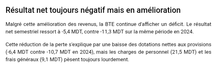 Avec l’amélioration de la gouvernance publique, Société Tunisienne de Banque et Banque de Tunisie et des Émirats pourraient renforcer leur crédibilité financière et attirer davantage d’investisseurs. Si les réformes se traduisent par une meilleure rentabilité et une gestion plus efficace, le marché pourrait progressivement valoriser leurs actions au-delà de la valeur nominal
