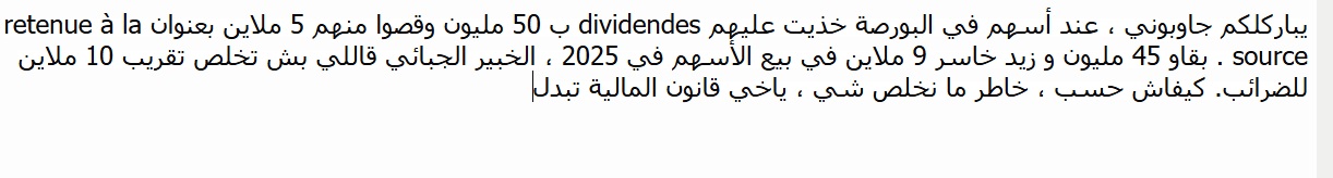 يباركلكم جاوبوني ، عند أسهم في البورصة خذيت عليهم dividendes ب 50 مليون وقصوا منهم 5 ملاين بعنوان retenue à la source . بقاو 45 مليون و زيد خاسر 9 ملاين في بيع الأسهم في 2025 ، الخبير الجبائي قاللي بش تخلص تقريب 10 ملاين للضرائب. كيفاش حسب ، خاطر ما نخلص شي ، ياخي قانون المالية تبدل