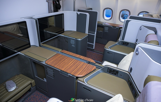 Air Côte d'Ivoire a opté pour une innovation supplémentaire : des suites entièrement fermées situées à l'avant de la cabine, qualifiées en interne de ‘'première classe gratuite''. Grâce à une configuration optimisée, ces sièges offrent une expérience équivalente à celle d'une véritable première classe tout en conservant la densité d'une cabine affaires. Le transporteur parle d'ailleurs de ‘'Première classe par Air Côte d'Ivoire'', une manière d'affirmer son ambition de rivaliser avec les standards des grandes compagnies du Moyen-Orient et d'Asie.