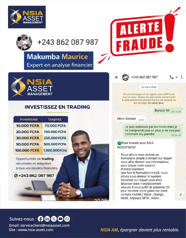 En effet, nous avons constaté qu'un individu ou un groupe d'individus, se présentant comme agent de NSIA Asset Management et utilisant un numéro WhatsApp congolais, propose des offres d'investissement avec des promesses de rentabilité peu réalistes, en utilisant abusivement le nom et l'image de marque de NSIA Asset Management. Il s'agit d'une activité frauduleuse totalement indépendante de notre entreprise.