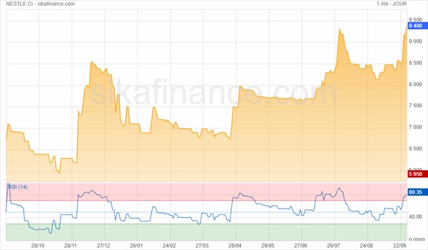 Pour l'heure, l'action de Nestlé Côte d'Ivoire maintient sa tendance haussière qui a débuté il y a plus de deux ans. À la clôture du marché au 28 septembre, elle était cotée à 9 400 FCFA, enregistrant ainsi une hausse de 14,01% depuis le début de l'année. Ce niveau de cotation représente un record historique pour l'action, jamais atteint auparavant. Toutefois, il convient de noter que la divulgation de cette performance moins reluisante pourrait soumettre l'action aux réactions du marché.