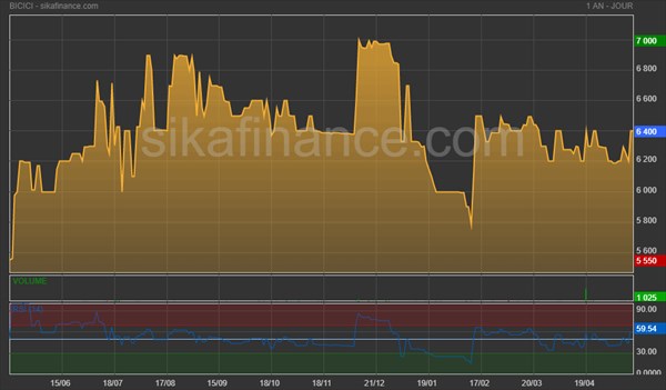 Depuis le début de l'année, l'action Bicici affiche une évolution stable avec un léger repli de 5,84% à 6450 FCFA à la clôture du 16 mai. Ce recul de l'action intervient après que le titre ait atteint son plus haut des 12 derniers mois à 7 000 FCFA en décembre dernier. Les prises de gains avaient poussé le titre à un seuil depuis 6 mois à 5 800 FCFA, avant de renouer à nouveau avec la croissance.