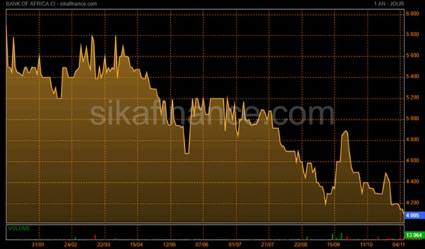 Evoluant dans un canal baissier depuis le début de l'année, l'action BOA CI a perdu plus de 30% de sa valeur à 4 095 FCFA à la clôture du 8 novembre. Quant à l'activité des investisseurs sur la valeur, elle s'établit à 2,5 milliards FCFA ce 8 novembre, soit un accroissement de 26% comparativement au volume observé sur l'ensemble de l'année 2021.