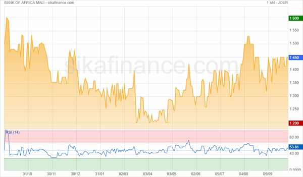 Sur les 9 mois de l'année, la valeur BOA Mali s'est légèrement appréciée de 3,57% à 1 450 FCFA. Elle a même atteint son plus haut niveau (1 530 FCFA) sur l'année en août, avant de redescendre à sa résistance de 1 450 FCFA. Depuis, le titre affiche un cours en forte fluctuation qui peine à passer ce niveau de prix. Cette situation pourrait être en lien avec le PER de 10.74x qu'affiche la valeur alors que la moyenne du secteur finance de la BRVM se situe à 6.63x. Quant au PBR de BOA Mali, il est de 0.77x pour une moyenne de 1.33x.