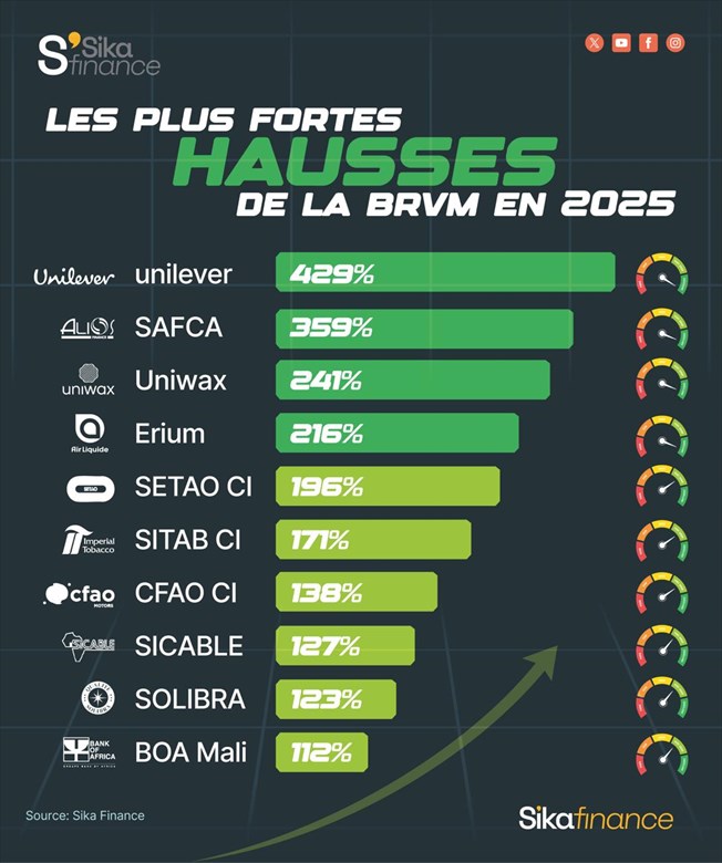 Avec une croissance annuelle de +25,26 %, la BRVM signe sa 5ᵉ meilleure performance historique. Le marché a enregistré 8 mois de hausse sur 12, porté par une vague d'achats soutenue et des volumes record dépassant 270 milliards FCFA.