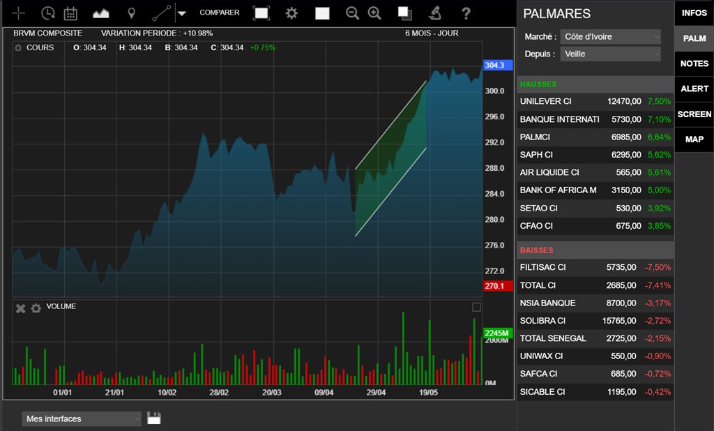 Le classement des plus fortes hausses est dominé par UNILEVER (+7,50 % à 12 470 FCFA) suivie par BICB (+7,10 % à 5 730 FCFA), qui signe ainsi sa deuxième progression supérieure à +7 % depuis son IPO, et PALM CI (+6,64 % à 6 985 FCFA).