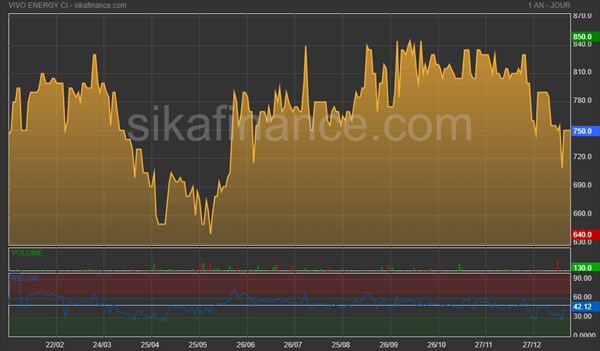 Après une progression de 5,33% en 2023, l'action Vivo Energy CI présente actuellement une tendance baissière, enregistrant une perte de 5,06% et s'établissant à 750 FCFA au 19 janvier 2024. Néanmoins, la solide performance financière affichée par la société au premier semestre et à fin septembre devrait amener les investisseurs à scruter de plus en plus la valeur de Vivo Energy CI.