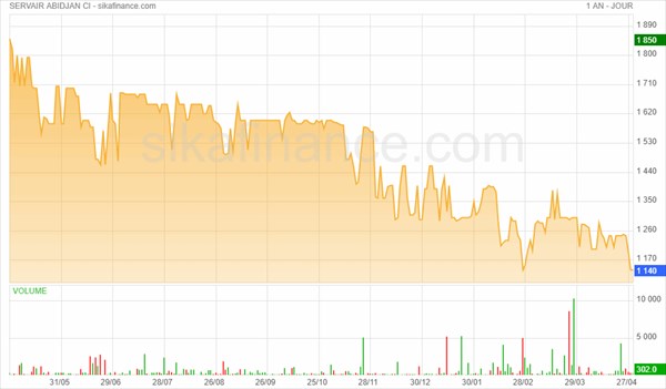 Malgré sa bonne performance réalisée, l'action Servair évolue toujours dans un canal baissier depuis le début de l'année avec une perte de 11,97 %. Dans le détail, l'action avait atteint son plus bas niveau le 28 Février 2023 avant de reprendre son évolution en dent de scie. A la clôture du vendredi 28 Avril 2023, le cours de l'action s'établissait à 1 140 FCFA, son récent bas niveau depuis le bas de l'année.