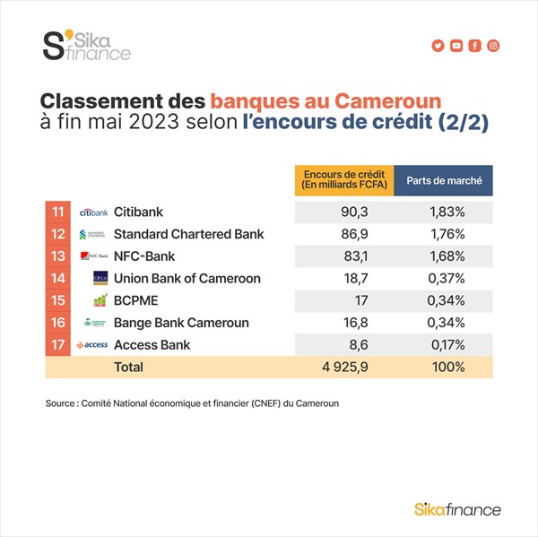 L'encours des crédits bancaires au Cameroun est ressorti à 4 925,9 milliards de FCFA (environ 7,5 milliards d'euros) au 31 mai 2023, selon les données du marché bancaire. Ce volume est en hausse de 14% par rapport à la même période un an en arrière où les 17 banques actives dans le pays cumulaient environ 4 348 milliards de dette courante.