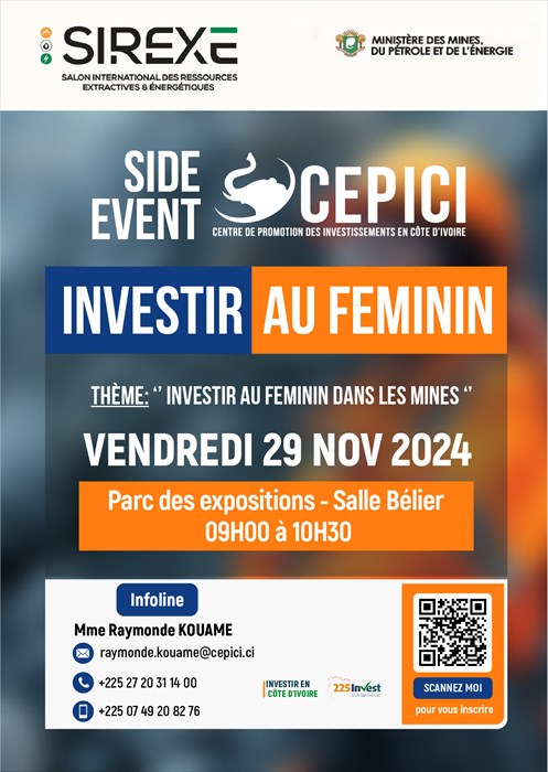 Dans le cadre de son programme " Investir au Féminin ", visant à accompagner l'investissement féminin dans les secteurs stratégiques, le CEPICI invite les femmes entrepreneures à participer à son Side Event intitulé “Investir au Féminin dans les mines”, prévu le vendredi 29 novembre 2024, à partir de 9 heures, dans la salle Bélier du Parc des Expositions d'Abidjan.