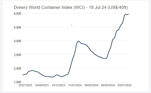 Depuis fin mars, les prix du fret ont triplé, atteignant un niveau 286% supérieur à celui de juillet 2023. Pour expédier un conteneur de 40 pieds de Shanghai vers New York, Los Angeles, Gênes, Rotterdam ou New York et Rotterdam, il faut désormais débourser 5 937 dollars USD, contre 1 790 USD à la mi-mars, indique Drewry, institution spécialisée dans l'analyse des marchés maritimes mondiaux. Si ce chiffre reste loin du pic de 10 377 USD atteint en septembre 2021, il n'en demeure pas moins alarmant.