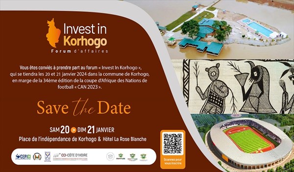 A l'occasion de la Coupe d'Afrique des Nations (CAN) qui aura lieu du 13 Janvier au 11 Février 2024, le Conseil Régional du Poro et l'Ambassade de la Côte d'Ivoire en Afrique du Sud en collaboration avec le CEPICI, la Chambre de Commerce et d'Industrie et la Mairie de Korhogo organise " Invest in Korhogo " du 20 au 21 janvier 2024.