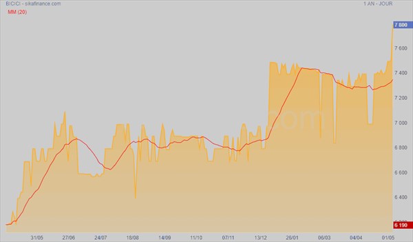 L'action BICICI affiche une évolution généralement haussière ces dernières années avec des plus-values de 5,41% depuis le 1er janvier, 25,81% sur 1 ans et 69,57% depuis 5 ans. L'annonce de cette bonne performance financière de la banque devrait renforcer la confiance des investisseurs en la valeur, qui évolue déjà à ses plus hauts niveaux depuis plus de 5 ans.
