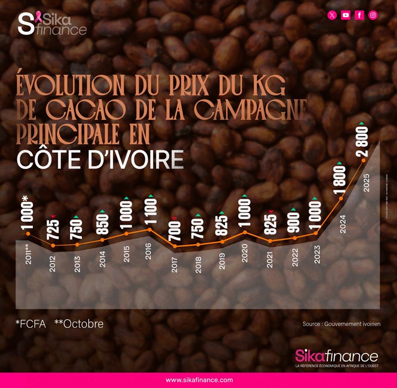 La Côte d'Ivoire ouvre sa nouvelle campagne cacaoyère sous le signe d'une envolée sans précédent. Le prix bord-champ garanti aux producteurs est fixé à 2 800 FCFA le kilo pour la campagne principale 2025-2026, un niveau inédit qui reflète à la fois la tension des marchés mondiaux et la volonté des autorités d'accroître les revenus paysans.