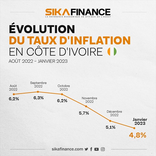 En Côte d'Ivoire, le taux d'inflation, en glissement annuel, s'est replié pour le 4ème mois consécutif à 4,8% en janvier 2023, contre 5,1% le mois précédent, selon les données de l'Institut national de la statistique.
