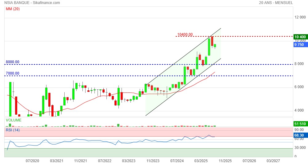 NSIA Banque CI poursuit sa trajectoire haussière dans un canal ascendant. Les indicateurs techniques restent favorables malgré un RSI proche de la zone de surachat. Sur le plan fondamental, la banque bénéficie d'une solide progression de son produit net bancaire, d'une rentabilité maîtrisée et de fonds propres robustes. La convergence entre dynamique technique et fondamentaux solides conforte une position acheteuse soutenue.