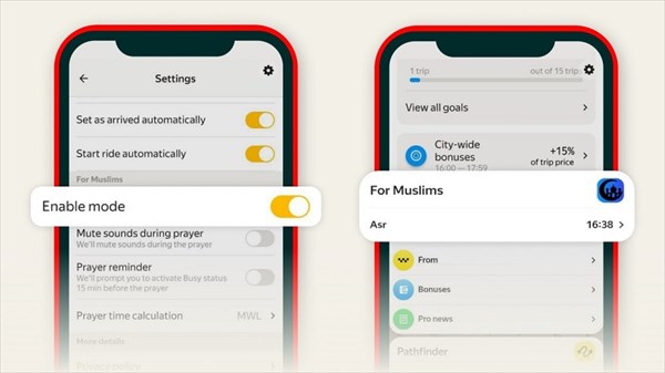 En activant cette fonction dans les paramètres de l'application, les chauffeurs partenaires reçoivent un rappel de 15 minutes avant chaque heure de prière et la mise en sourdine automatique de toutes les notifications de l'application au début des heures de prière. La possibilité de mettre en pause les notifications de commande garantit qu'ils ne manquent aucune course potentielle, qui est ensuite attribuée à d'autres conducteurs à proximité. La fonction indique également la direction de la Qibla et affiche le programme des prières pour les deux jours à venir. Les conducteurs ont la possibilité de régler le calcul de l'heure de la prière en fonction de leur convention islamique préférée.