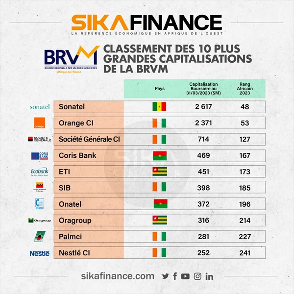 Sur les 46 entreprises cotées à la BRVM, 11 sociétés se sont hissées dans le top 250. En effet, 3 sociétés ont fait leur entrée dans le classement, portant ainsi le nombre à 11 contre 7 sociétés en 2022. La part de la BRVM dans la capitalisation boursière globale s'est ainsi passée de 0,87% à 1,53% en l'espace d'une année. La première entreprise de la BRVM est Sonatel qui s'est améliorée de 7 places pour s'établir à la 48ème position du classement africain (6ème place du classement ouest africain) avec une capitalisation de 2,6 milliards de dollars.