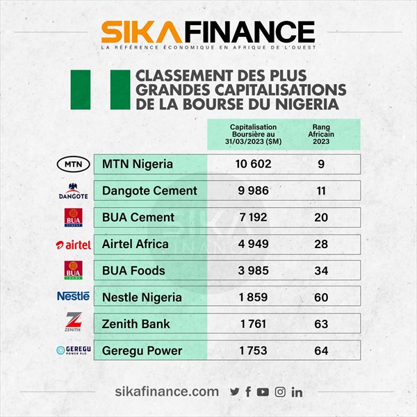 Selon cette même enquête, la part du Nigeria dans la capitalisation boursière globale s'est établie à 9,2% contre 8,53% en 2022. Ainsi, le nombre de compagnies nigérianes dans le classement a augmenté de trois, portant son chiffre à 22. MTN Nigeria est la première société ouest-africaine à se positionner dans le top 10 du classement (9ème du classement africain) avec une capitalisation boursière de 10,6 milliards de dollars pour l'année 2023, suivie par une autre société de télécommunication, Airtel Africa, en 28ème position du classement africain (4ème du classement ouest-africain) avec 6,9 milliards de dollars.