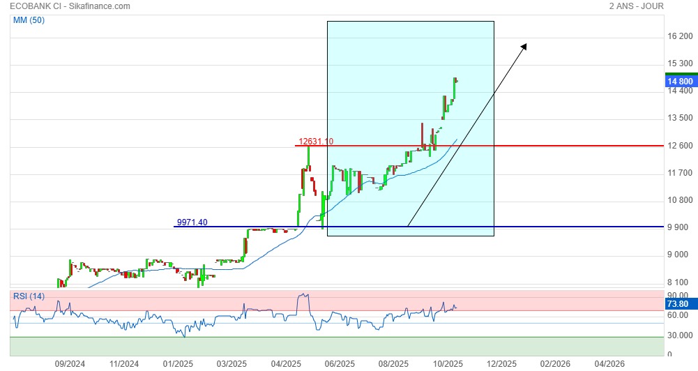 À la BRVM, le titre Ecobank CI évolue dans une tendance haussière soutenue, favorisée par la résilience de ses fondamentaux et la dynamique positive du secteur bancaire régional. Les signaux techniques confirment cette orientation, avec un RSI à 73,06, indiquant une zone de surachat. Si ce niveau traduit un potentiel de poursuite de la hausse, il appelle également à une vigilance accrue pour identifier un éventuel point d'arbitrage.