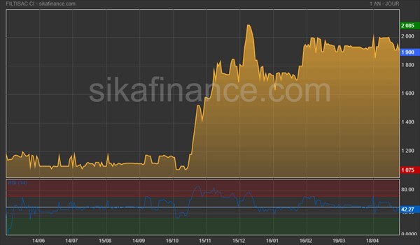 A l'annonce des résultats financiers de la société, le titre avait clôturé à 1 900 FCFA, qui représentait un léger gain de 3,26% depuis le début de l'année. Une performance qui devrait être vite mitigée par le faible rendement du dividende ainsi que le repli de 82% à 25 millions FCFA du bénéfice du premier trimestre. Nous sommes peut-être au début d'un trend baissier de la valeur.
