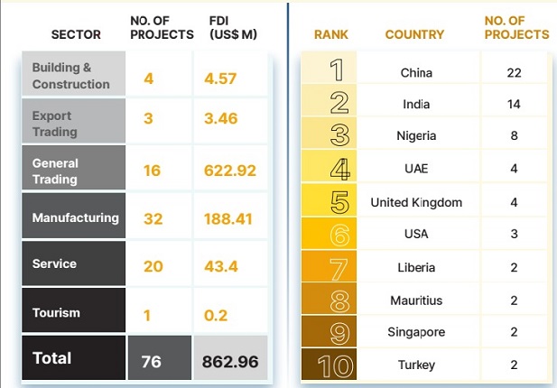 Entre janvier et juin 2025, le GIPC a validé 76 projets d'IDE. Le secteur manufacturier arrive en tête en termes de nombre de projets, avec 32 initiatives recensées. Mais c'est le commerce général qui capte l'essentiel des capitaux, avec 622,92 millions de dollars, soit plus de 72% des flux totaux.