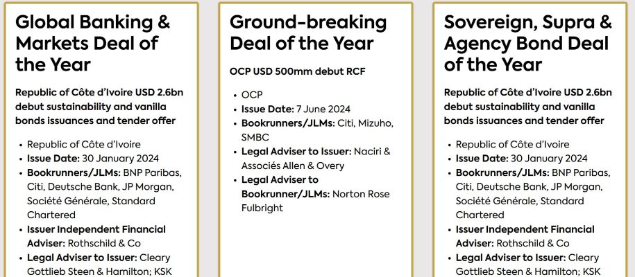 L'institution ivoirienne s'est vu attribuer deux distinctions majeures : “Sovereign, Supra & Agency Bond Deal of the Year” et “Global Banking & Markets Deal of the Year”, venant récompenser des opérations financières d'envergure menées avec brio sur les marchés internationaux. Organisés depuis 2014, ces prix sont aujourd'hui l'une des références majeures pour évaluer la qualité des émissions sur les marchés émergents, tant en termes de structuration que d'innovation et de mobilisation de liquidités.