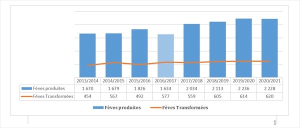 La production nationale a connu une croissance rapide et soutenue, passant ainsi de 1,5 million de tonnes de fèves de cacao en 2011/12 à 2,2 millions de tonnes en 2020/21, soit une croissance moyenne de 7 %/an sur la période, si l'on exclut la campagne 2016/17 caractérisée par la persistance du phénomène climatique – El Niño[1] – qui a entrainé une chute de la production de cacao.