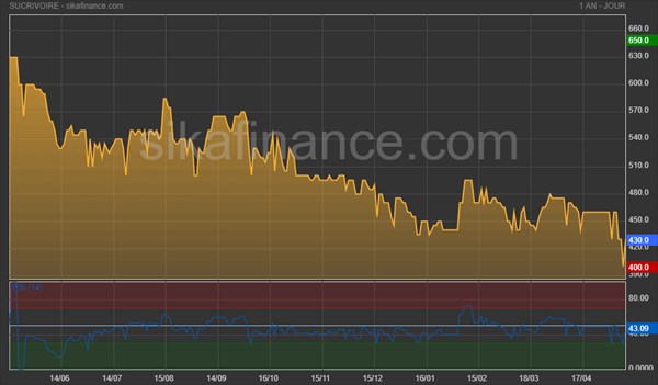 Depuis le début de l'année, la valeur Sucrivoire entretient une dynamique baissière. En effet, son cours évolue à ses plus bas niveaux de ces quinze dernières années, passant à 430 FCFA à la date du 13 mai 2024, soit une moins-value de 10,47%.