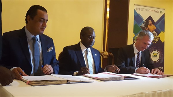 De gauche à droite : Anis Abidi : DG Eklectic, Mr Isaac Gnamba Yao : DG LaPoste CI, Mr Sébastien Codeville : DG KaiOs
