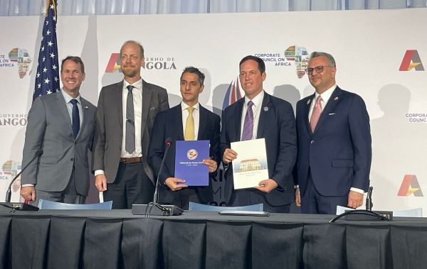 Massad Boulos, conseiller principal des États-Unis pour l'Afrique (à droite) et Troy Fitrell, du Bureau américain des affaires africaines (à gauche) rejoignent Aleem Karmali, directeur de RHPCL (au centre) et Brian Kelly, PDG d'Anzana Electric (2e à droite) lors de la signature de l'invitation à l'accord de partenariat pour le projet hydroélectrique régional Ruzizi III