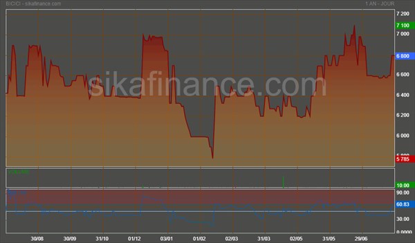 Depuis le début de l'année, la Valeur BICICI affiche un cours légèrement en baisse de 0,74% à 6 800 FCFA. Le titre a enregistré de fortes fluctuations de son cours. En effet, en février 2023 la valeur a atteint son plus bas (5 785 FCFA) depuis plus d'un an, tandis qu'en mars 2023 elle atteignait son plus haut niveau (7 100 FCFA). D'un point de vue fondamentale, la BICICI affiche un PBR et un PER supérieurs à la moyenne du secteur bancaire de la BRVM. En effet, le PBR et le PER affichent respectivement 1,53x et 9,15x contre des moyennes de 1,28x et 6,34x.