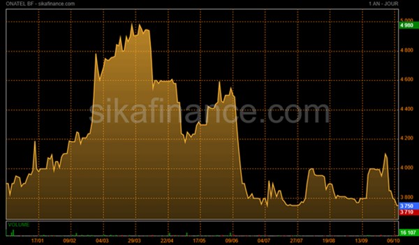 L'action ONATEL affiche depuis le début de l'année un repli de 4,94%. Dans le détail, le titre avait enregistré un important bond au premier trimestre en touchant son plus haut (4 980 FCFA) depuis plus de 4 ans le 25 mars dernier. Au vu de cette performance réalisée, les investisseurs se sont empressés pour les prises de gains faisant baisser le cours de l'action. Dans cette dynamique, sont intervenus les résultats peu satisfaisants du premier trimestre qui ont entretenu la tendance baissière. Ainsi, jusqu'à la clôture du vendredi 7 octobre le titre avait accumulé une perte totale de 25%. Avec l'annonce des performances ternes du premier semestre, l'action pourrait à nouveau être sanctionnée par les investisseurs.
