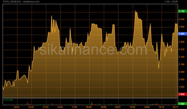 L'action Total SN s'inscrit depuis le début de l'année dans une tendance haussière. De fait, l'action a engrangé une plus-value de 21,77% à 2 405 FCFA au 04 novembre 2022 avec son plus haut des 5 dernières années atteint à 2 735 FCFA (24 août). Une bonne conduite du titre sera alors observée au fil du temps en corrélation avec ses bonnes perspectives et son ancrage dans les énergies renouvelables.