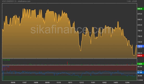 L'action Vivo Energy CI affiche une tendance baissière depuis le début de l'année avec un recul de 6,67% au 9 mai. Si les performances financières sont sur de bons rails, le marché de la BRVM est pour sa part orienté rendement avec un niveau d'acceptation de 10% en 2023. Avec un rendement en deçà des 8%, ces efforts du distributeur pourraient passer inaperçus.