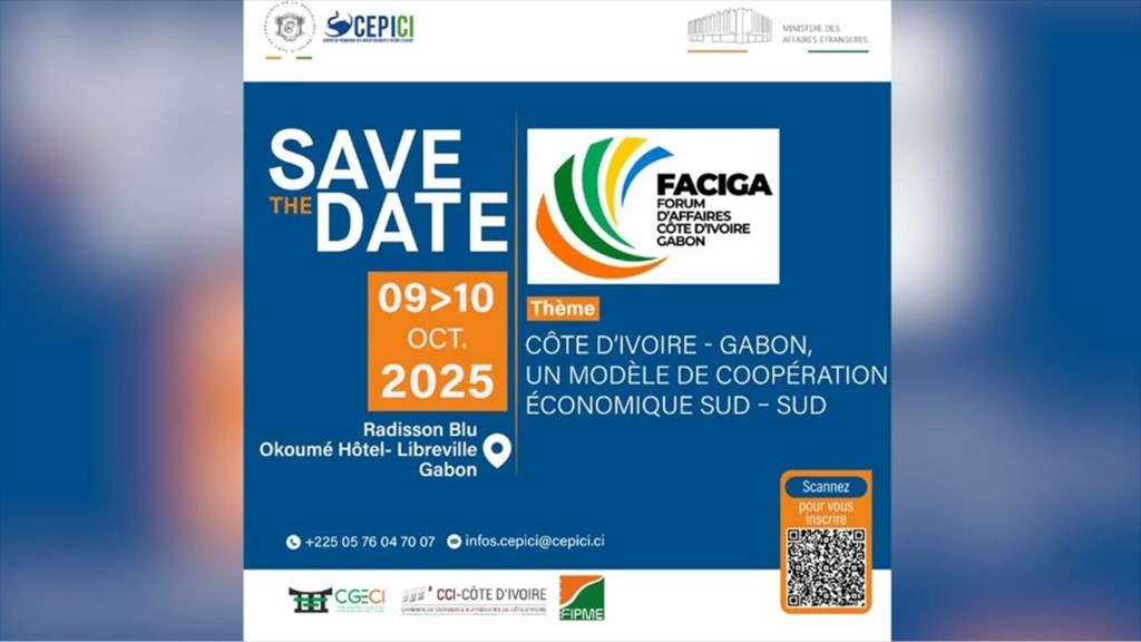 Le premier Forum d'Affaires Côte d'Ivoire-Gabon (FACIGA), initialement prévu les 9 et 10 octobre 2025 à Libreville, a été reporté à une date ultérieure. L'annonce a été faite ce vendredi 3 octobre par l'Agence Nationale de Promotion des Investissements du Gabon (ANPI-Gabon), co-organisatrice de l'événement aux côtés du Centre de promotion des investissements en Côte d'Ivoire (Cepici) et de l'ambassade de Côte d'Ivoire au Gabon.